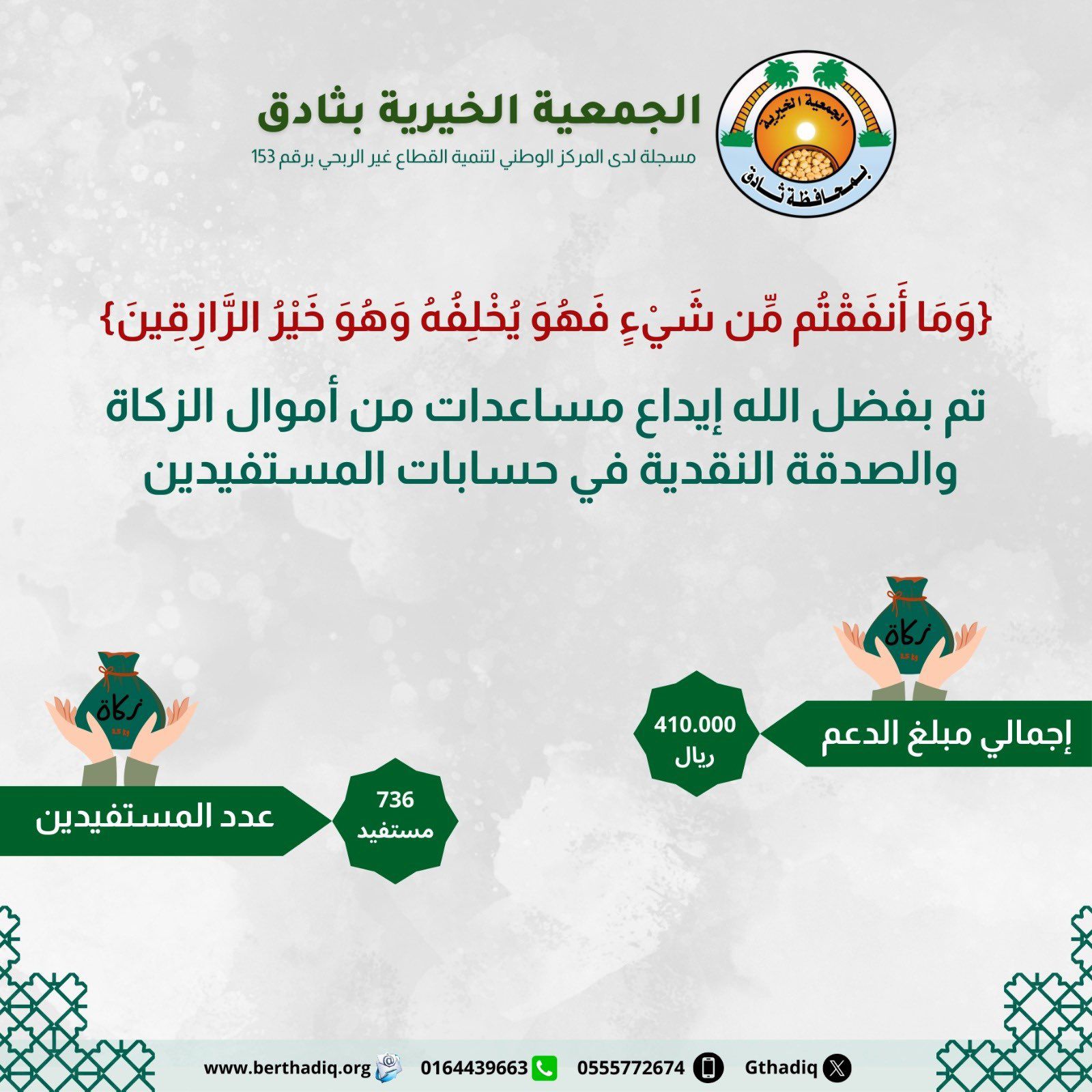 تم بحمد الله إيداع مساعدات من أموال الزكاة و الصدقة النقدية في حسابات المستفيدين في الجمعية وقد بلغ ما تم إيداعه 410،000 ر ..
