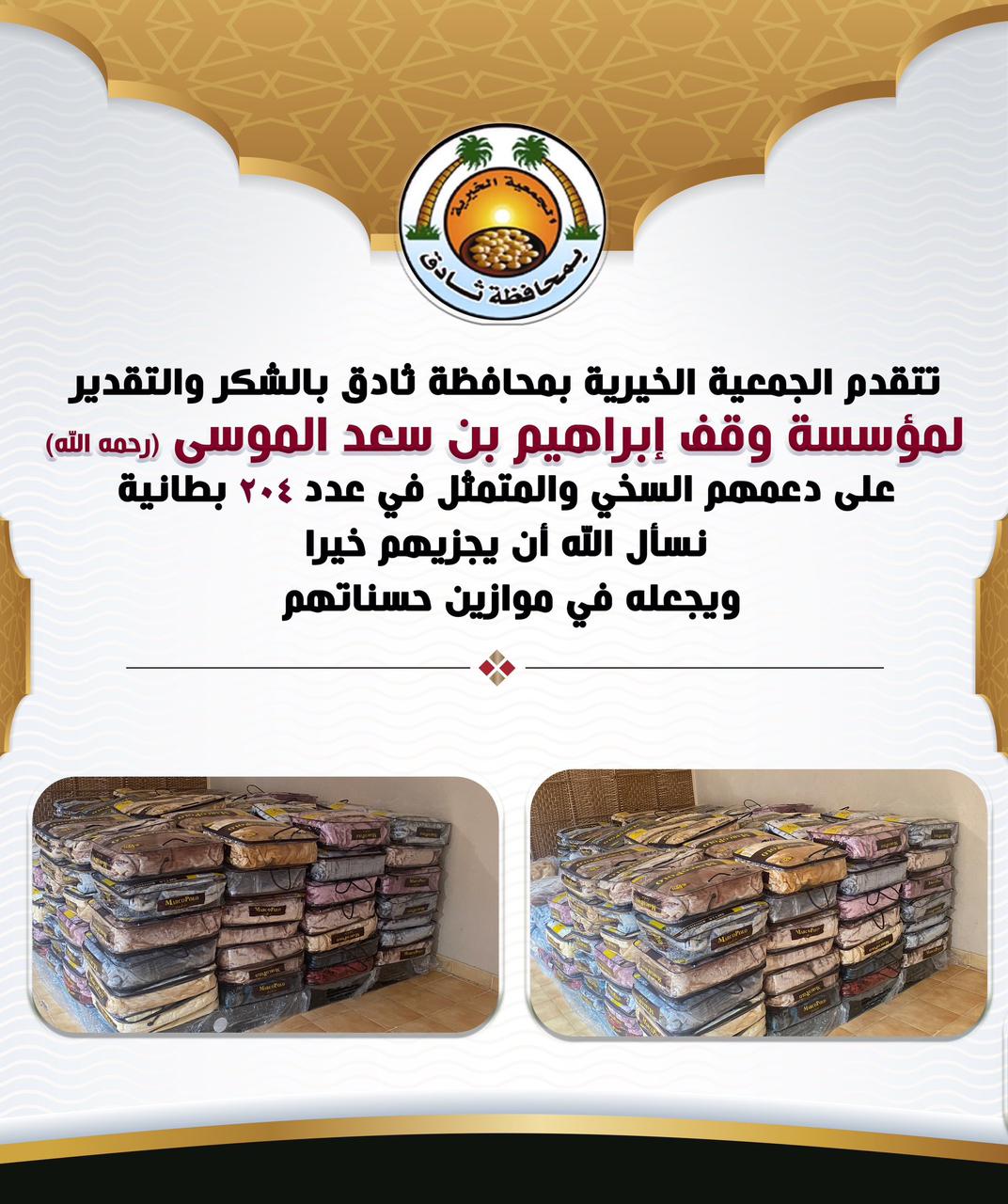 تتقدم الجمعية الخيرية بمحافظة ⁧‫#ثادق‬⁩ بالشكر والتقدير لمؤسسة وقف إبراهيم بن سعد الموسى على دعمه ..