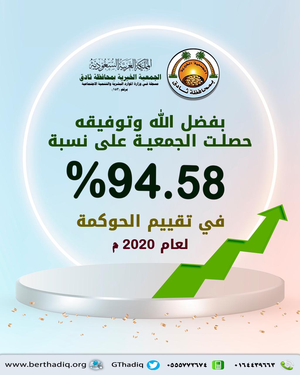بفضل الله وتوفيقه حصلت الجمعية الخيرية بمحافظة ⁧‫ثادق‬⁩ على درجة 94.58٪ في تقييم معايير ⁧‫الحوكمة ..